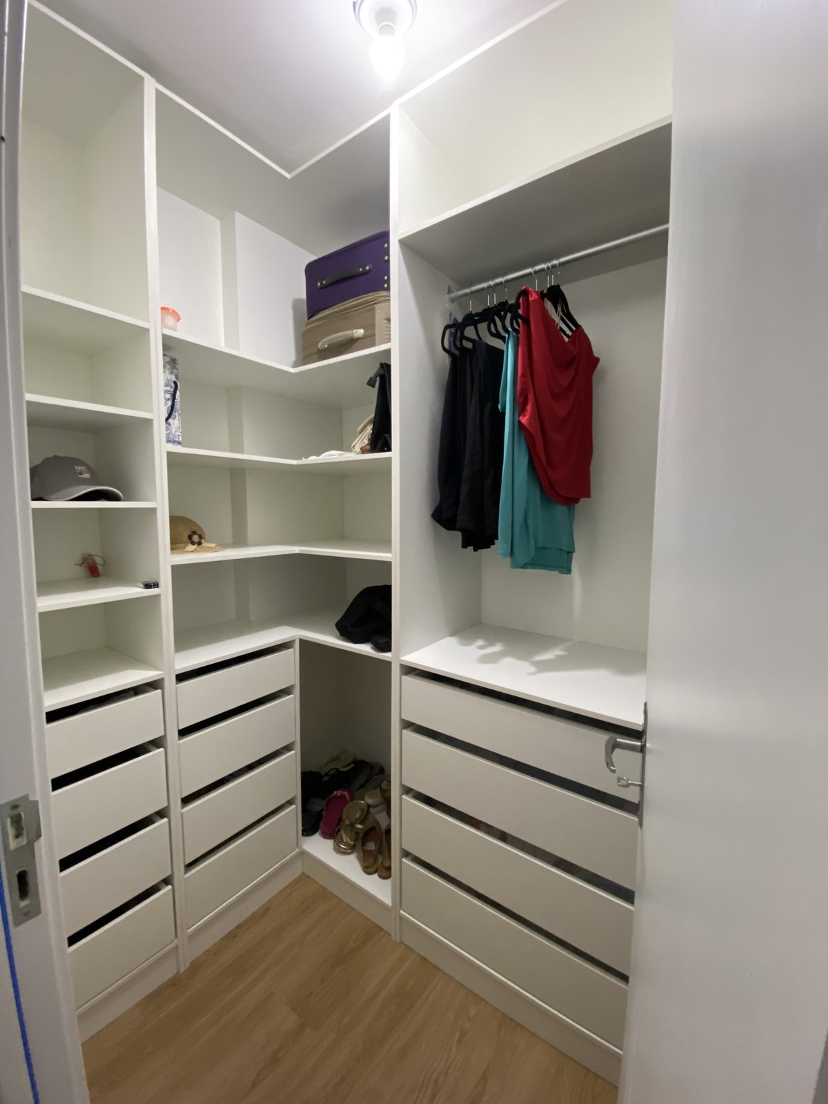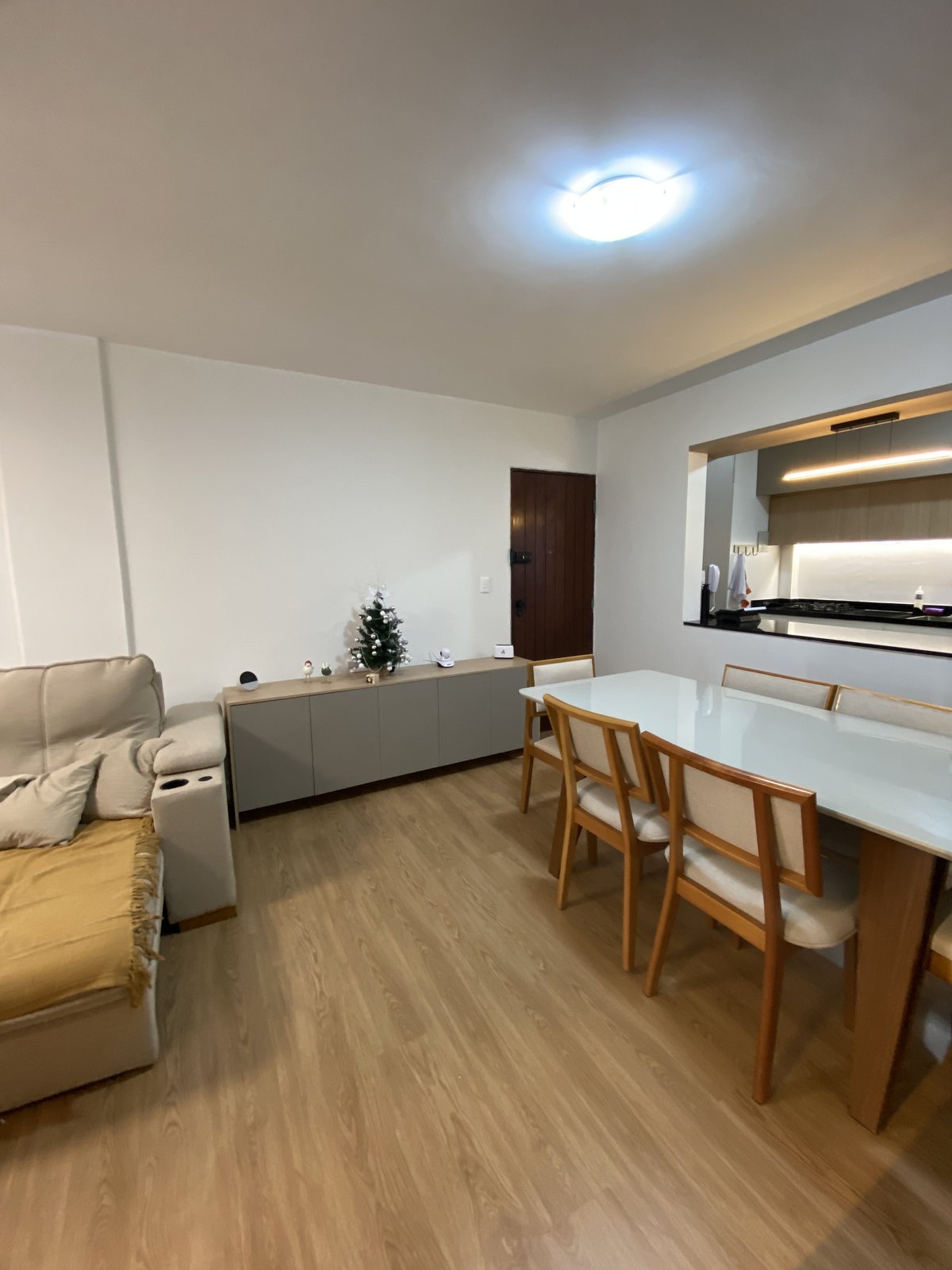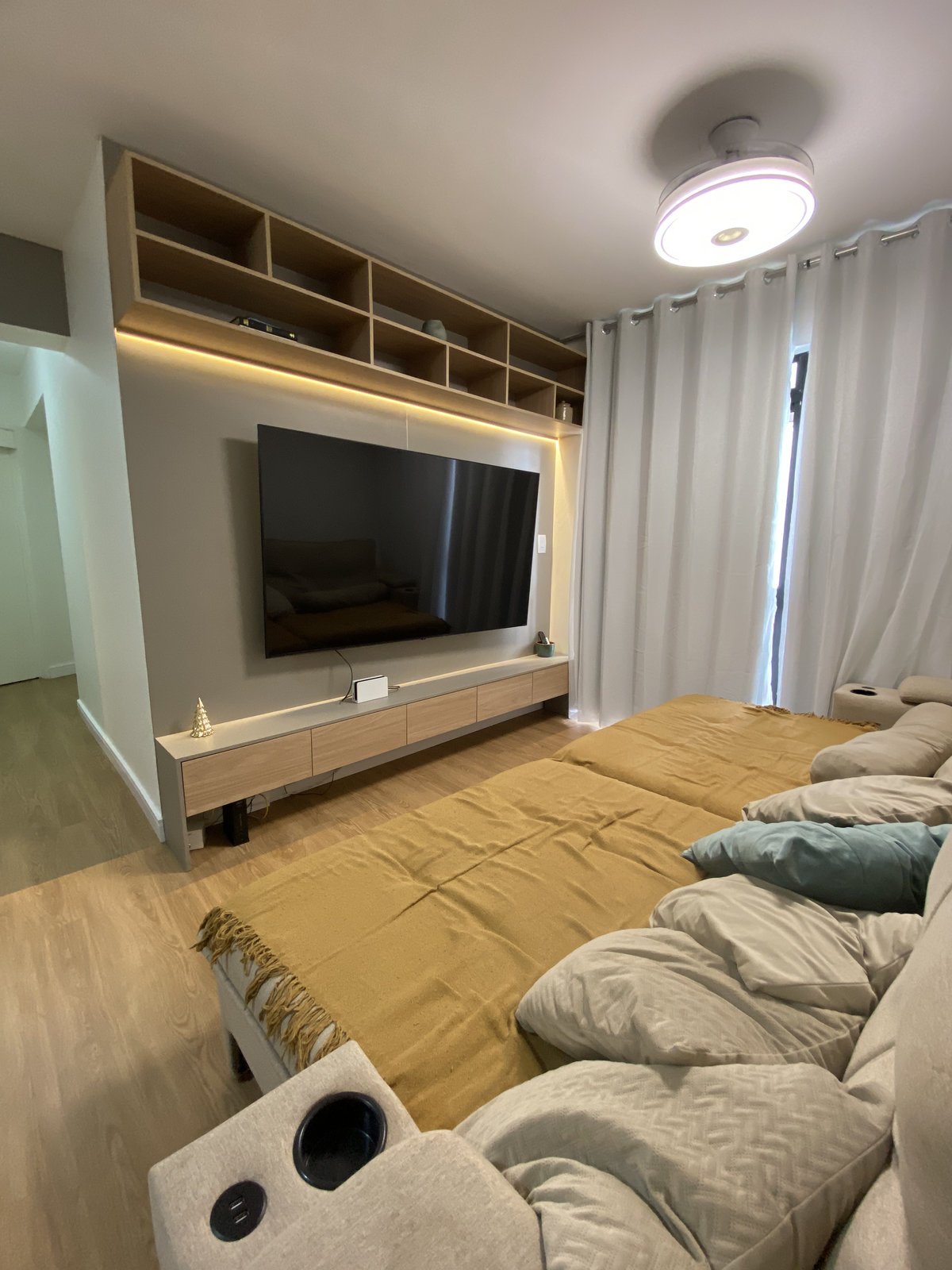 O contraste foi a chave para o sucesso: o uso inteligente do Branco nas paredes e marcenaria inferiror da cozinha e lavanderia garante que, apesar dos tons mais fechados, o apartamento mantenha a sensação de amplitude, luz e sofisticação. A funcionalidade foi essencial: a casa foi planejada com máximo armazenamento para operar como um lar principal. Estruturalmente, a integração total da cozinha e da sala não só potencializou a convivência, mas também resolveu o fluxo de iluminação natural. O aconchego é reforçado pela marcenaria de fundo quente, iluminação com fitas de LED e o conforto do piso vinílico