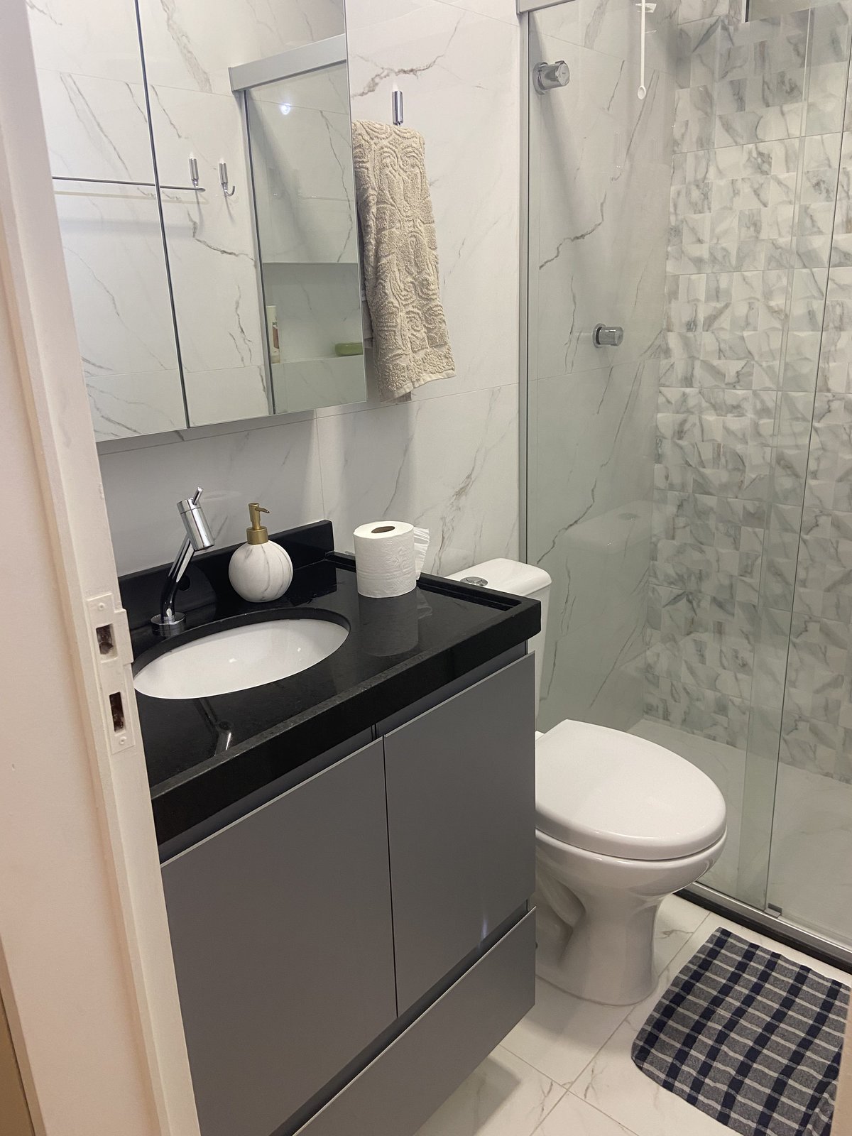 Enquanto as salas e quartos se vestem de tons neutros e uma iluminação cénica que desenha diferentes emoções, a cozinha surge como o coração pulsante da identidade, transbordando personalidade em cada textura. Nos banheiros, a pureza do Mármore Calacatta sela o projeto, transformando o branco num porto seguro de luxo e mansidão. É a harmonia perfeita entre o sossego do agora e a força das raízes.